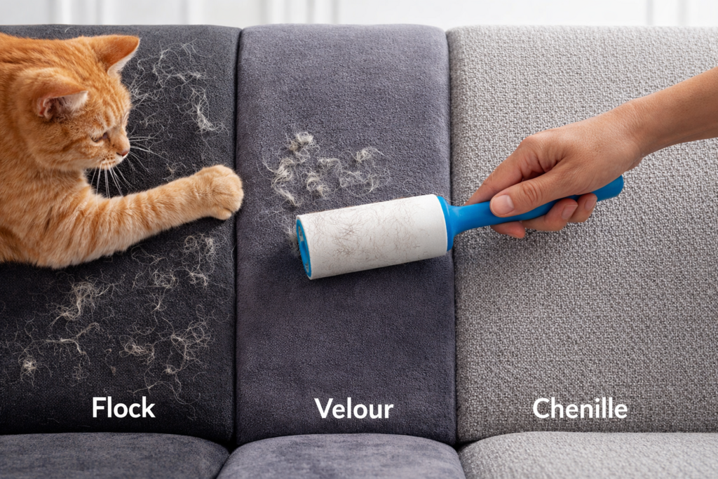 Если вы ищете, какую обивку выбрать если есть кошка, флок – один из самых удачных вариантов. У него обычно плотная основа, нет выраженных переплетений, а шерсть с поверхности убирается сравнительно легко. Для тех, кто выбирает мебель для дома с котом, это практичное решение на каждый день.